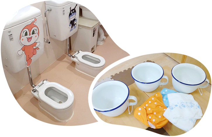 0歳児は布おむつを使用、布おむつを使用することで保育士との関わりが多くなります。いち早く汚れたおむつを取り替えてもらうことで「快」を知る事が出来、自ら「不快を」訴えるようになります。1歳児クラスでは、トイレに座ることが習慣付き、2歳から3歳になる頃には、1日綿パンツで過ごす事が出来るようになります。
